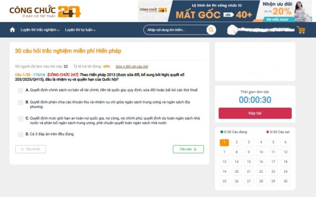 Luyện trắc nghiệm tại Công chức 247 không chỉ đơn thuần là làm bài mà còn là một quá trình học tập có định hướng. Hệ thống câu hỏi được xây dựng bám sát đề thi thực tế, giúp thí sinh tiếp cận đúng nội dung cần ôn tập.