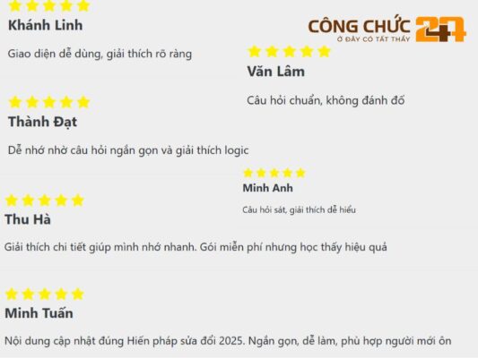 Bộ trắc nghiệm Hiến pháp tại Công chức 247 được xây dựng theo hướng bám sát nội dung cốt lõi của Hiến pháp, tập trung vào các điều khoản dễ ra thi. Các câu hỏi được thiết kế đa dạng, có tính phân loại cao và đi kèm lời giải chi tiết, giúp người học hiểu đúng bản chất vấn đề, tránh học thuộc lòng máy móc.
