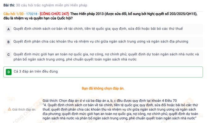 Thay vì chờ đợi, thí sinh hoàn toàn có thể chủ động luyện tập sớm thông qua các gói trắc nghiệm công chức Lai Châu 2026 có đáp án chi tiết chỉ có tại Công chức 247.