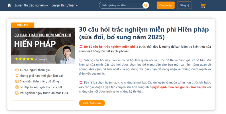Gói luyện được xây dựng dựa trên cấu trúc đề thi công chức thực tế, giúp người học làm quen với dạng câu hỏi ngay từ đầu. Các câu hỏi được phân chia theo từng văn bản quan trọng như Hiến pháp, Luật, Nghị định…, giúp bạn ôn tập có trọng tâm, không bị lan man.